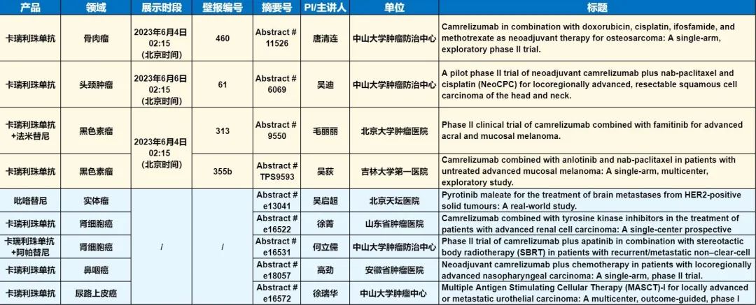 此外,在头颈肿瘤、黑色素瘤、骨肉瘤、鼻咽癌、肾细胞癌、尿路上皮癌等多个领域,卡瑞利珠单抗、吡咯替尼等产品相关研究一共入选了4项壁报展示和5项线上发表,彰显了AG视讯医药强大的自主研发综合实力。